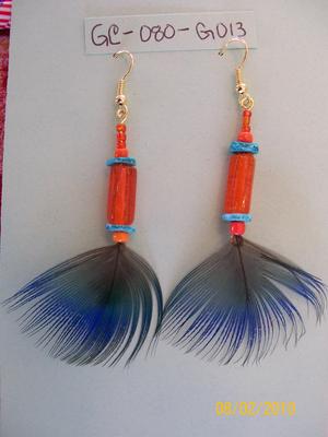 This is a naturally molted blue tipped peacock body feather with orange and teal glass beads. These earrings are 3.5 inches long with gold colored ear wire hooks. There are no shipping charges for this item.